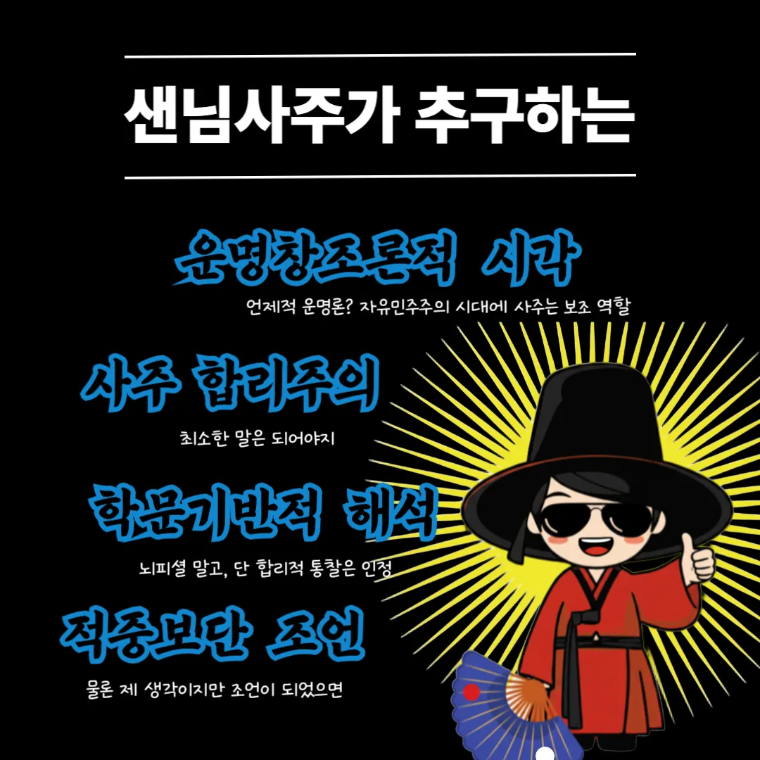 문외한이 보기에 사주가 어렵고 신비해보이지만 모든 분야가 그렇습니다. 현대인의 시선으로 사주를 공부하면 하나의 학문일 뿐입니다. 따라서 사주를 맹신하게 만드는 태도는 배제합니다.